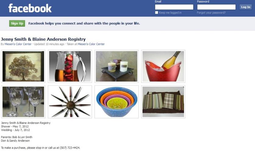 Family and friends can view your registry by visiting our storeor online on Facebook (click on the Photos tab). We can assistyour local and out of town family and friends in selecting a giftfrom your registry and completing the purchase either in person or by phone.